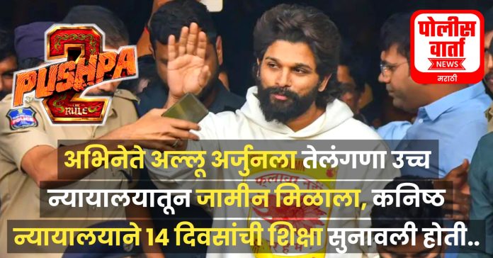 पोलीस वार्ता, हैदराबाद: ‘पुष्पा 2’ चित्रपटाच्या प्रदर्शनादरम्यान महिलेचा मृत्यू झाल्याप्रकरणी तेलंगणा उच्च न्यायालयाने… अभिनेता अल्लू अर्जुन शुक्रवारी चार आठवड्यांसाठी अंतरिम जामीन मंजूर करण्यात आला आहे. त्यानंतर आज सकाळी तो कारागृहातून बाहेर आला आहे. खरं तर, हैदराबाद कोर्टाने अभिनेत्याला 14 दिवसांची न्यायालयीन कोठडीत पाठवण्याचा आदेश दिला होता. त्यानंतर हे प्रकरण तेलंगणा उच्च न्यायालयात पोहोचले. जामीन मिळाल्यानंतरही या अभिनेत्याला एक रात्र तुरुंगात काढावी लागली. कारण शुक्रवारी रात्री उशिरापर्यंत कारागृह प्रशासनाला जामिनाची प्रत मिळाली नव्हती.