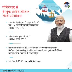 केंद्रीय मंत्रिमंडळात घेतलेल्या निर्णयाबाबत मंत्री अश्विनी वैष्णव म्हणाले की, “राष्ट्रीय रोप-वे डेव्हलपमेंट प्रोग्राम – तारे रपाटम प्रकल्पांतर्गत उत्तराखंडमधील गोविंदघाट ते हेमकुंड साहिब जी पर्यंतच्या 12.4 किमी लांबीच्या रोप-वे प्रकल्पाच्या विकासास मंत्रिमंडळाने मान्यता दिली आहे.