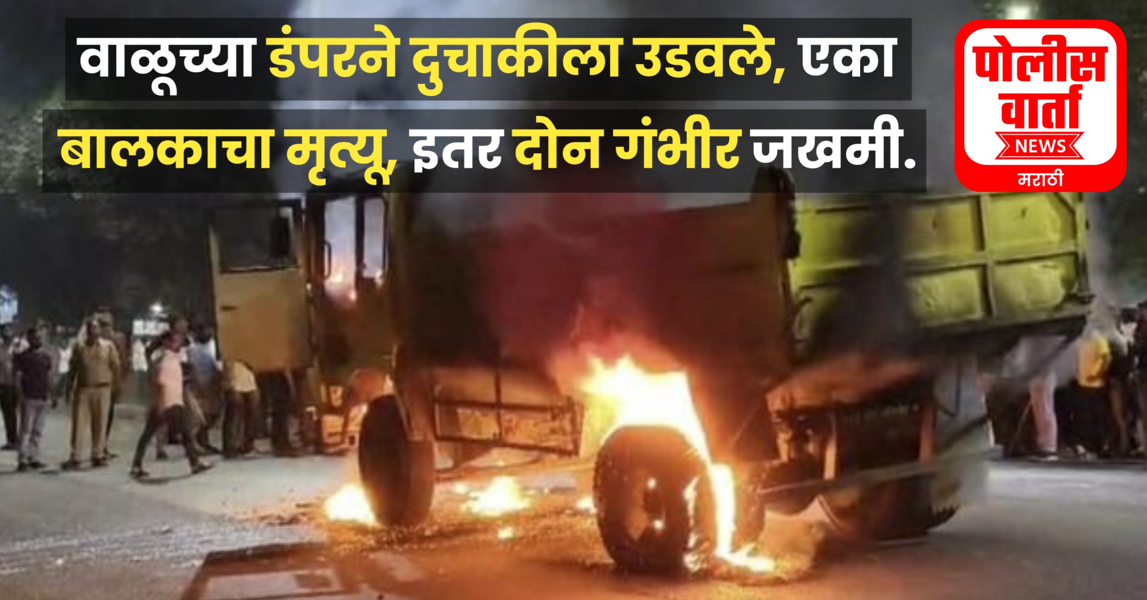 डंपरने बालकास चिरडले, दुसऱ्या बालकांची प्रकृती गंभीर आहे. जमावाने वाहनास पेटवले..