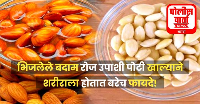 पोलीस वार्ता, आरोग्य | जेव्हा ही ड्रायफूट्सचा उल्लेख केला जातो तेव्हा सर्वात आधी बदामाचे नाव घेतले जाते. बदाम जगातील सर्वात लोकप्रिय आणि निरोगी हेल्दीनट्स एक आहे. बदामाचा आहारात अनेक प्रकारे समावेश करता येतो. आम्ही तुम्हाला सांगतो की बदामामध्ये जीवनसत्त्वे, फायबर, अँटिऑक्सिडंट्स, पॉलिफेनॉल, निरोगी चरबी, प्रथिने, झिंक, मॅग्नेशियम आणि ओमेगा -3 फॅटी ऍसिड यांसारख्या खनिजे भरपूर प्रमाणात असतात. जे शरीराला अनेक प्रकारच्या समस्यांपासून वाचवण्यास मदत करते. भिजवलेले बदाम रोज सकाळी रिकाम्या पोटी सेवन केल्यास शरीराला अनेक फायदे मिळू शकतात. चला तर मग जाणून घेऊया भिजवलेले बदाम कोणी खावेत.