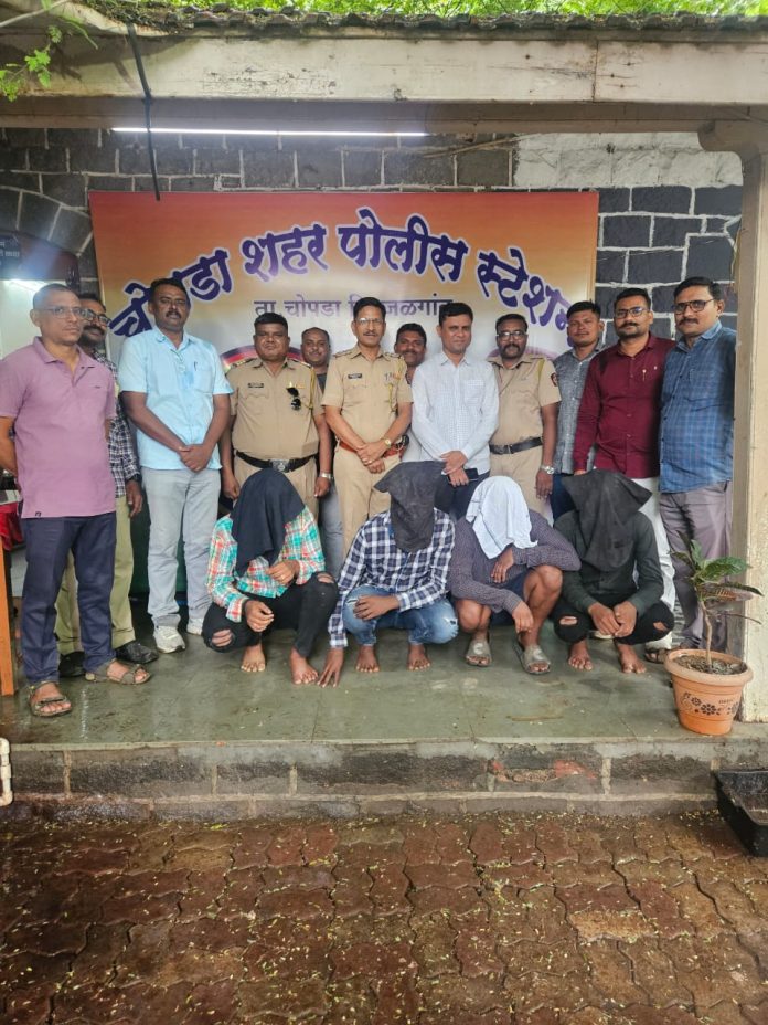 चोपडा- शहरात रात्री १०:४५ वाजेचा सुमारास चोपडा शहर पो.स्टे.पोलीस निरीक्षक मधुकर साळवे यांना मिळालेल्या गुप्त बातमी नुसार चोपडा शहर पोलिसांनी मामलदे शिवारात चोपडा ते चुंचाळे रोडवर शिताफीने मोटर कार क्र-एम.एच.१४ ए एस- ७९०५ या अंधारात निर्जन स्थळी थांबलेल्या मोटर कारचा शोध घेवुन तिच्यातील ६ इसमांना ताब्यात घेतले. सदर वाहनामध्ये लोखंडी टॉमी, मिरची पुड, दोर हे घरफोडी व जबरी चोरी करण्यासाठी वापरले जाणारे साहित्य मिळुन आले. एकदरीत सदर इसम काहीतरी गुन्हेगारी कृत्य करण्याच्या उद्देशाने सदर ठिकाणी थांबले असल्याचा संशय बळावल्याने नुमद इसमांचे काही गुन्हेगारी रेकार्ड आहे का याची तपासणी केली असता त्यापैकी ३ इसमांवर खुन, दरोडा, जबरी चोरी. खंडणी. दंगल, आर्म अॅक्ट अशां गंभीर स्वरुपाचे गुन्हे पुणे येथील पिंपरी चिंचवड व निगडी या पोलीस ठाण्यामध्ये दाखल असल्याचे निष्पन्न झाले आहे. पिंपरी चिचंवड पोलीसांना संपर्क केला असता नमुद इसम हे कुख्यात व अतिशय धोकादायक गुन्हेगार असल्याची माहिती दिली. सदर इसम हे दरोड्याची तयारी करुनच चोपडा येथे थांबल्याचे निष्पन्न झाल्यावरुन त्यांचे ताब्यातील मोटर कार, मोबाईल फोन, रोख रक्कम, लोखंडी टाँमी, मिरची पुड, दोर असा एकुण १०,८१,०००/-रु.कि.चा मुद्देमाल जप्त करण्यात आला असुन त्यांचे विरुध्द चोपड़ा शहर पोलीस ठाण्यात भारतीय न्याय साहिता कलम ३१० (४) ३१० (५) प्रमाणे गुन्हा नोंद करण्यात आला असून सदर गुन्हयाचा तपास सपोनि एकनाथ भिसे हे करीत असुन मिळुन आलेल्या इसमांपैकी ३ इसम हे अल्पवयीन असल्याने त्यांना बालन्यायमंडळ जळगांव येथे पाठविण्यात आले असून उर्वरीत ३ इसम नामे १) तुषार उर्फ तुषल्या गौतम झेंडे वय-२५ वर्ष रा.उर्वल सोसायटी निगडी पिंपरी चिचंवड जि.पुणे २) विनोद राकेश पवार वय-२५ वर्ष रा. दत्तनगर चिंचवड जि. पुणे ३) सुनिल गोरख जाधव वय-३० वर्ष रा.दत्तनगर चिंचवड जि.पुणे यांना अटक करुन दि-२६ रोजी मा. चोपडा न्यायालय यांचे कडे हजर केले असता त्यांना दि २९ रोजी पावेतो पोलीस कोठडी मंजुर करण्यात आली आहे.