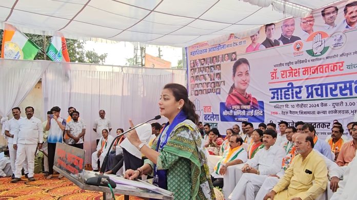 येथील भुसावळ विधानसभेचे महाविकास आघाडीचे काँग्रेस पक्षाचे अधिकृत उमेदवार डॉक्टर राजेश मानवतकर यांच्या प्रचारार्थ आज १० रविवार रोजी दुपारी तीन वाजता नेहरू मैदानावर जाहीर सभा झाली.यावेळी खासदार प्रणिती शिंदे बोलत होत्या प्रतिस्पर्धी महायुतीचे उमेदवार संजय सावकारे यांनी गेल्या पंधरा वर्षा मध्ये कोणतेही विकास कामे न केल्याने जनता नाराज आहे.जनतेला सुवर्ण संधी मिळाली आहे त्यांनी या निष्क्रिय सरकारला त्यांची जागा दाखवावी व काँग्रेस पक्षाचे उमेदवार यांना भरघोस मतांनी विजयी करावे असे आवाहन भुसावळकरांना केले आहे.