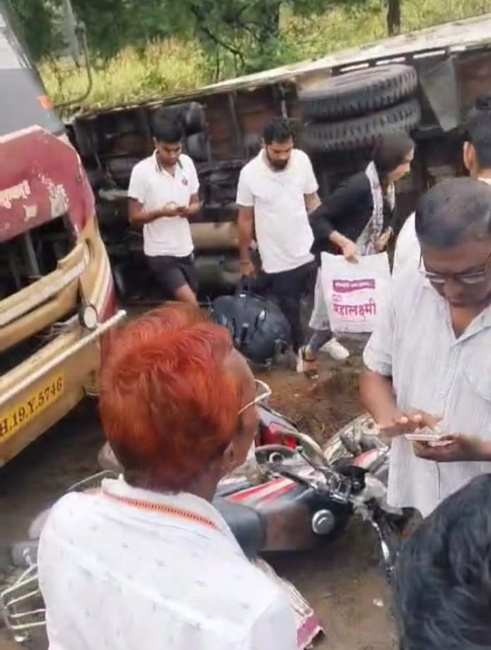 त्यात ठिकाणी केदार लक्झरी गाडी क्रमांक एम एच 19 वाय 57 46 गर्दीतून पुढे काढतांना लक्झरी गाडीने मोटरसायकल क्रमांक एम एच 19 ए डब्ल्यू 94 48 या मोटरसायकलला धडक दिली त्यात वासुदेव फेगडे वय 35 व आमोदा येथील किरण पाटील यांच्या मोटरसायकलला धडक दिल्याने त्यांच्या दोघांच्या पायांना जबर दुखावत झालेली आहे