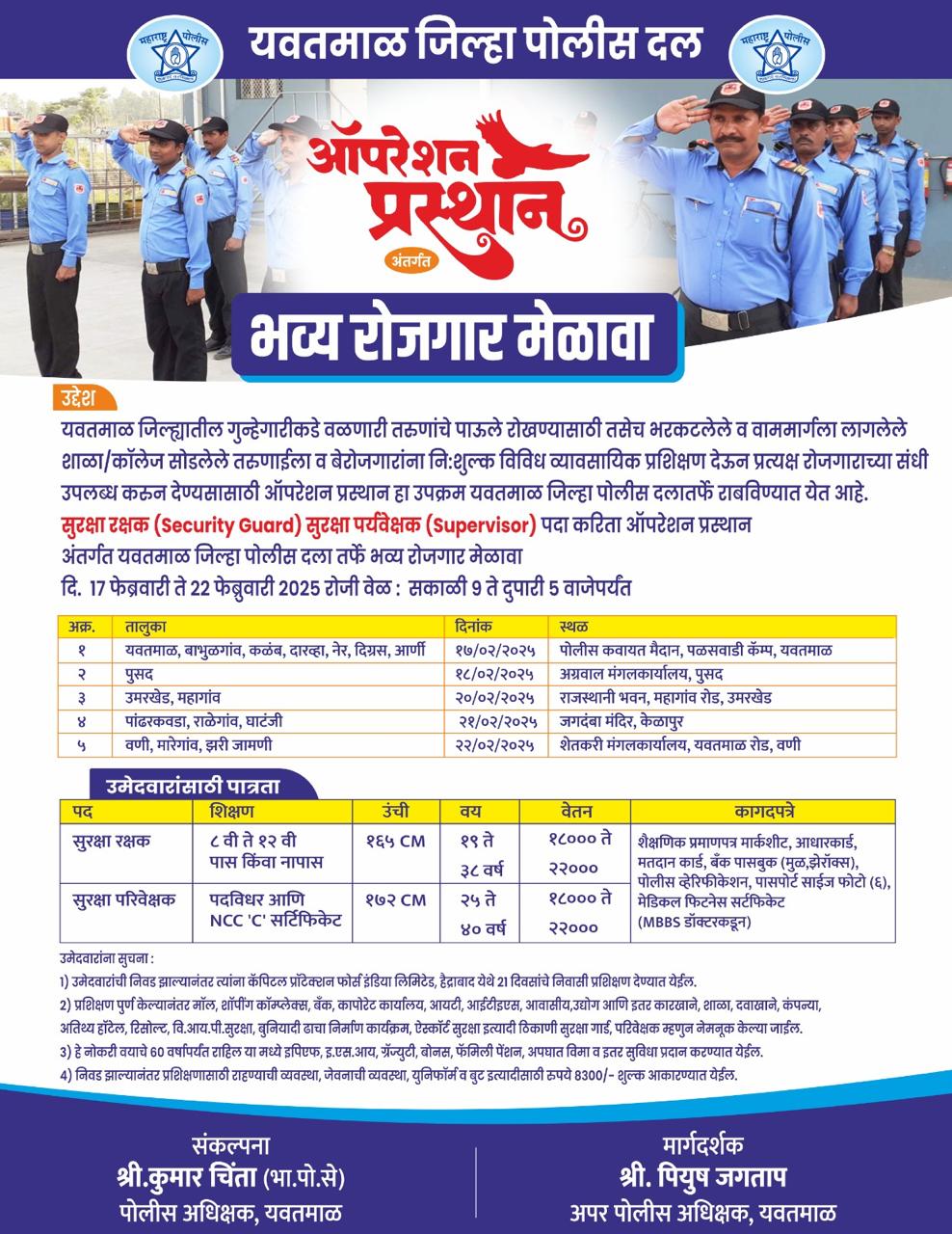 पोलीस वार्ता, यवतमाळ : जिल्हा पोलीस दलाचे वतीने ‘रोजगार मेळावा-ऑपरेशन प्रस्थान’ हा उपक्रम यवतमाळ जिल्ह्यातील विविध तालुक्यात दि.17 फेब्रुवारी ते 22 फेब्रुवारी 2025 दरम्यान राबविण्यात आला.