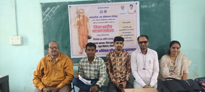 बुरहानपूर – सुरज दहे  मध्य प्रदेश जन अभियान परिषद् विकासखंड खकनार द्वारा शासकीय सुभाष उत्कृष्ट स्कूल खकनार  मे आदि योगी शंकराचार्य जी की जयंती के अवसर पर व्याख्यान कार्यक्रम का आयोजन किया गया कार्यक्रम में मुख्य अतिथि संदीप महले उद्बोधन मे बताया गया कि शंकराचार्य जी द्वारा भारत को एक सूत्र मे बांधा गया और चारो दिशाओं मे चार मठो की स्थापना की गई इसका मुख्य उद्देश्य अलग अलग जाति मे बंटे समाज को एक करने का रहा है।