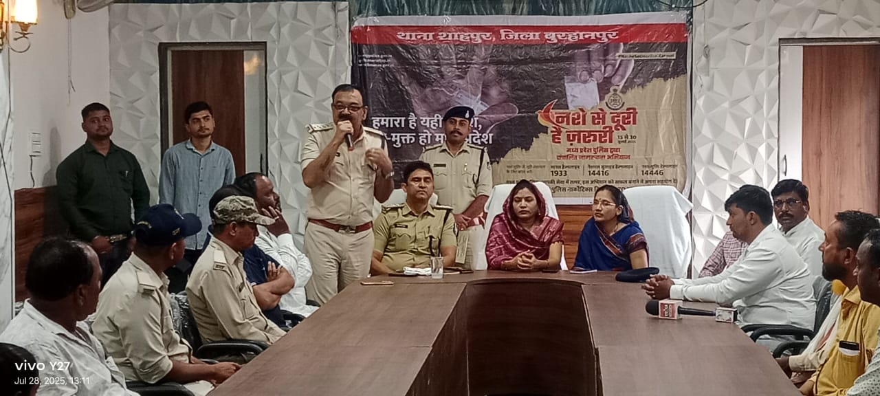 संजय तायडे की खबर। बुरहानपुर जिले के शाहपुर तहसील के पुलिस थाना शाहपुर के माध्यम से नशा मुक्ति कार्यक्रम नगर शाखा शाहपुर में किया गया इस कार्यक्रम में डीएसपी प्रीतम ठाकुर अखिलेश मिश्रा थाना प्रभारी शाहपुर अध्यक्ष साधना वीरेंद्र तिवारी उपाध्यक्ष रंजना गोपाल चौधरी एवं वार्ड के पांच समाजसेवी शाहपुर के जनता उपस्थित रही इस कार्यक्रम को सर्वप्रथम शाहपुर थाना प्रभारी, अखिलेश मिश्रा द्वारा नशे से दूर रहने के लिए एक फिल्म का प्रसारण कर, उपस्थितियो कों नशे के दुष्प्रभाव होने वाले शारीरिक हानी एवं आर्थिक मानसिक के बारे में एक फिल्म में बताया गया शाहपुर नगर परिषदअध्यक्ष साधना वीरेंद्र तिवारी ने सभी को संबोधित करते हुए बताया की जिस प्रकार शाहपुर को पन्नी मुक्त किया गया है इस तरह शाहपुर को नशा मुक्ति करने के लिए परिश्रम करेंगे ।