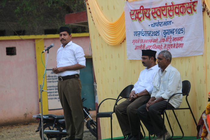 ग्राम चापोरा ( रमाकांत मोरे) में आज राष्ट्रीय स्वयंसेवक संघ का पथ संचलन निकाला गया। जिसमे चापोरा मंडल के तीनसौ से अधिक स्वयंसेवकों ने भाग लिया। कार्यक्रम की अध्यक्षता श्री सदाशिव सीताराम हानोते द्वारा की गयी। मंच पर राष्ट्रीय स्वयंसेवक संघ के शाहपुर खंड के मान. संघचालक भी उपस्थित थे। कार्यक्रम के मुख्य वक्ता श्री अभयजी विश्वकर्मा जिला प्रचारक थे। अपने व्याख्यान में मुख्य वक्ता ने बताया कि संघ कार्य किसी के विरोध अथवा प्रतिक्रिया का परिणाम न होकर राष्ट्र के लिए जीने वाले लोग खड़े करना है। ऐसे लोगो से ही राष्ट्र सशक्त होगा। इस संगठीत शक्ति का समाज में प्रकटीकरण करने हेतु संघ में संचलन की परम्परा है।