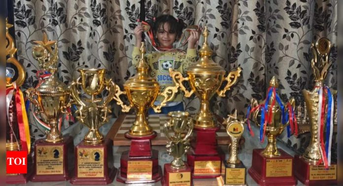 5 वर्षांची आरिनी लाहोटी तिने जिंकलेल्या ट्रॉफीसह पोझेस (टीओआय फोटो)