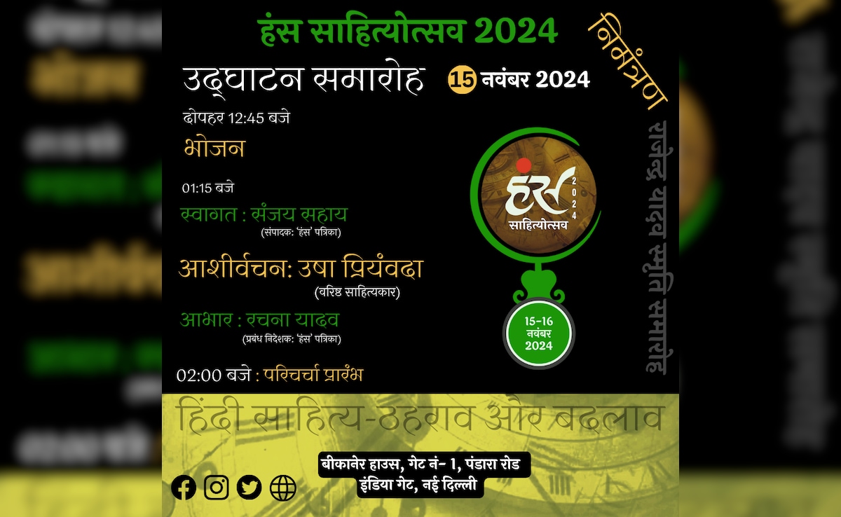 हंस साहित्योत्सव २०२४: हिंदी साहित्यातील सर्वात प्रसिद्ध आणि प्रतिष्ठित मासिक ‘हंस’ च्या वार्षिक सोहळ्याचा ‘हंस साहित्योत्सव – 2024’चा टप्पा सज्ज झाला आहे. १५ आणि १६ नोव्हेंबर रोजी होणाऱ्या या साहित्य संमेलनात देशभरातील दिग्गज लेखक, कवी, विचारवंत, चित्रपट दिग्दर्शक, चित्रपट अभ्यासक आणि कलाकार सहभागी होणार आहेत. दुपारी १२ वाजल्यापासून बिकानेर हाऊस, पंडारा रोड, नवी दिल्ली येथे हा कार्यक्रम आयोजित करण्यात आला आहे. या दोन दिवसीय कार्यक्रमात ‘हिंदी साहित्य : स्थिरता आणि बदल’ या विषयाला केंद्रस्थानी ठेवून सहा सत्रांत विविध विषयांवर चर्चा होणार आहे.