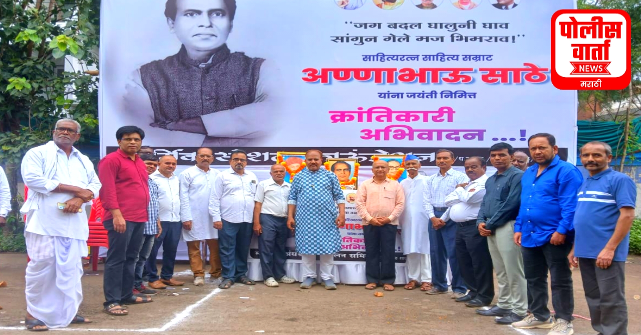 पोलीस वार्ता, नाशिक : लोकशाहीर, साहित्यिक आण्णाभाऊ साठे यांच्या 105 व्या जयंतीदिनानिमित्त 1 ऑगस्ट रोजी, पेंढारकर कॉलनी, जेलरोड येथील शिवरत्न सांस्कृतिक कला व क्रीडा मंडळाच्या वतीने आण्णाभाऊ साठे जयंती उत्साहात साजरी करण्यात आली. यावेळी परिसरातील नागरिक मोठ्या संख्येने उपस्थित होते. आण्णाभाऊंच्या प्रतिमेला पुष्पहार अर्पण करून सर्वांनी अभिवादन केले.