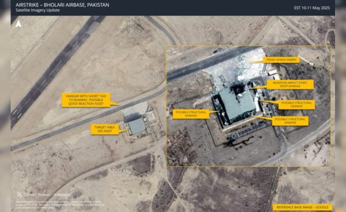 कावस्पेसच्या वेगवेगळ्या छायाचित्रांमुळे पाकिस्तानच्या भोलारी एअरबेसवर होणारे नुकसान दिसून आले. चित्रानुसार, हँगर खराब झालेले दिसते, जे मोडतोड आणि स्ट्रक्चरल नुकसान दर्शविते. पाकिस्तानी एअरबेसवरील विनाशाचे उपग्रह फोटो एक्स (पूर्व ट्विटर) वापरकर्त्याने सामायिक केले आहेत.