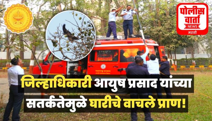 त्याचवेळेस आवारातील उंच झाडावरून पक्ष्याचा आवाज ऐकू आला. इतर वेळेपेक्षा हा आवाज वेगळा होता. त्यामुळे जिल्हाधिकारी प्रसाद यांच्या संवेदनशील मनाला हा आवाज वेगळा जाणवल्याने त्यांनी एवढ्या धावपळीत ही झाडाकडे बारकाईने पाहिले असता एका घारीच्या पंखात पतंगाचा मांजा अडकल्याचे निदर्शनास आले. जिल्हाधिकारींनी ही बाब अग्निशमन दलाचे मुख्य अधिकारी बैरागी व यांच्यासह आपत्ती व्यवस्थापन विभागाला कळविली. त्यानुसार अग्निशमन दल आणि आपत्ती व्यवस्थापन विभागाच्या पथकाने सदर ठिकाणी पोहचून या घारीची मांजातून सुटका करून तिला मुक्त केले आहे. या घटनेतून जिल्हाधिकारी आयुष प्रसाद यांच्यातील प्राणी प्रेमाची झलक पाहिला मिळाली.