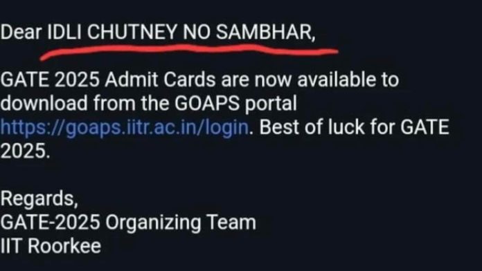 पोस्ट Reddit वर वापरकर्त्याने शेअर केली होती / No_Yogurt8713. शेअर केलेल्या स्क्रीनशॉटमध्ये, “प्रिय इडली चटणी नो सांभार” असे लिहिलेले एक विचित्र आणि न जुळणारे ग्रीटिंग होते, त्यानंतर “GATE 2025 Admit Cards आता GOAPS पोर्टलवरून डाउनलोड करण्यासाठी उपलब्ध आहेत.” युजरने लिहिले, “हा काही प्रकारचा विनोद आहे का? मला GATE कडून हा अधिकृत मेल आला आहे. हे जाणूनबुजून आहे का? ते अशी चूक कशी करू शकतात?” खालील पोस्ट पहा: