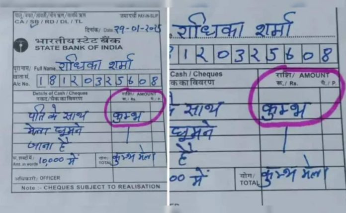 ज्यांनी बँकेत पैसे जमा केले त्यांना या स्लिपची जाणीव असेल. पैसे जमा करण्यासाठी या प्रक्रियेतून जाणे सामान्य आहे, परंतु डिपॉझिट स्लिपमधील महिलेने दर्शविलेले पराक्रम नक्कीच विचार करण्यापलीकडे आहे. हेच कारण आहे, सोशल मीडियावर ही ठेव स्लिप अंदाधुंदपणे व्हायरल होत आहे. २ January जानेवारी २०२25 रोजी लिहिलेल्या या स्लिपवर खाते धारकाचे नाव राधिका शर्मा लिहिले गेले आहे, ज्यांनी बँकेत १०,००० रुपये जमा करण्यासाठी ही स्लिप भरली. यामध्ये, हे रोख/चेकच्या तपशीलांमध्ये लिहिलेले आहे, पतीसह जत्राला भेट देण्यासाठी. त्याच वेळी, ‘कुंभ’ राशीच्या स्तंभात आणि योगाच्या स्तंभात ‘कुंभ मेला’ मध्ये लिहिलेले आहे.