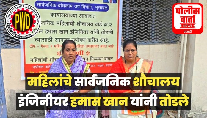सार्वजनिक बांधकाम विभागाच्या इंजिनीयर हमास खान यांनी कुठलीही कायदेशीर परवानगी न घेता महिलांचे सार्वजनिक शौचालय जेसीबीने तोडले..